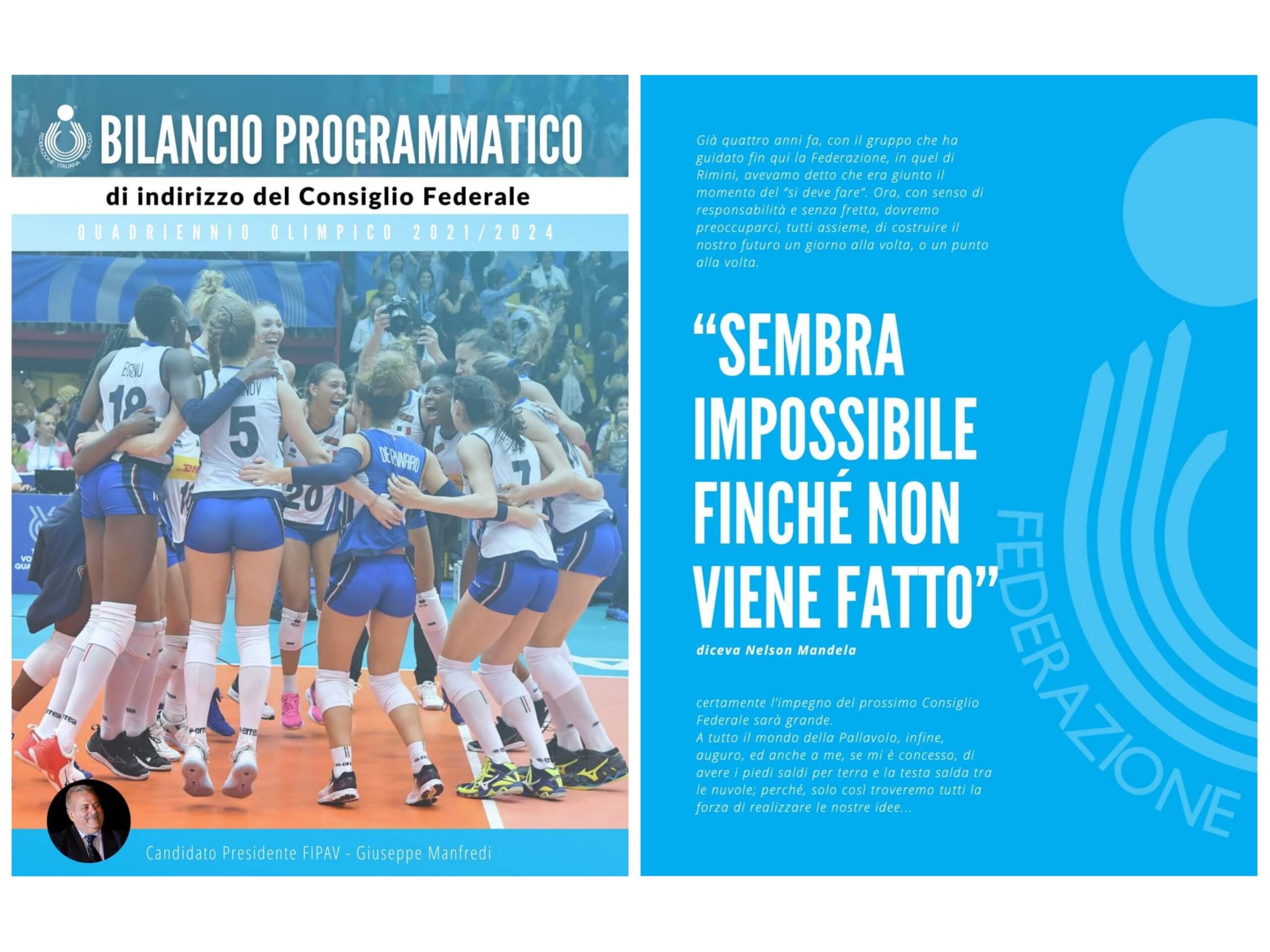 Il programma di Giuseppe Manfredi per il quadriennio 2021/2024 della Federazione Italiana Pallavolo. Domenica Manfredi sarà eletto Presidente della FIPAV al termine della 45a Assemblea Nazionale che si concluderà mercoledì 10 marzo con lo scrutinio e la proclamazione.