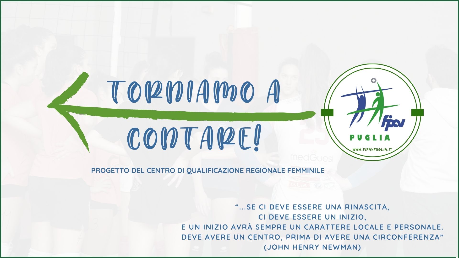 TORNIAMO A CONTARE è un’iniziativa promossa dal Centro di Qualificazione Femminile Puglia per tornare a prendere contatto col territorio dopo due anni in cui, causa pandemia, si è fortemente limitata l’attività delle società e del CQR soprattutto su alcune fasce d’età. Contare in questo contesto, quindi, assume valore molteplice e primario. È un concetto che esprime fiducia nel lavoro e nel sostegno reciproco, nel poter contare l’uno sull’altro. Inoltre contare vuol dire anche tornare a darsi valore dopo mesi di grande difficoltà per tutti i protagonisti della pallavolo pugliese, esprime il bisogno reciproco di accrescere il valore di ciascuno in termini di quantità e qualità della proposta sportiva. Infine contare è inteso anche nel suo significato più letterale di monitorare lo stato di salute dell’attività giovanile femminile su tutto il territorio pugliese con particolare riferimento alle annate Under15, Under14 e Under13 (2007-2008-2009 per la stagione corrente) raccogliendo dati sui numeri delle tesserate, sulla loro dislocazione geografica e sulle loro caratteristiche tecniche ed antropometriche. Il tutto in un contesto di gioco, aggregazione e divertimento.