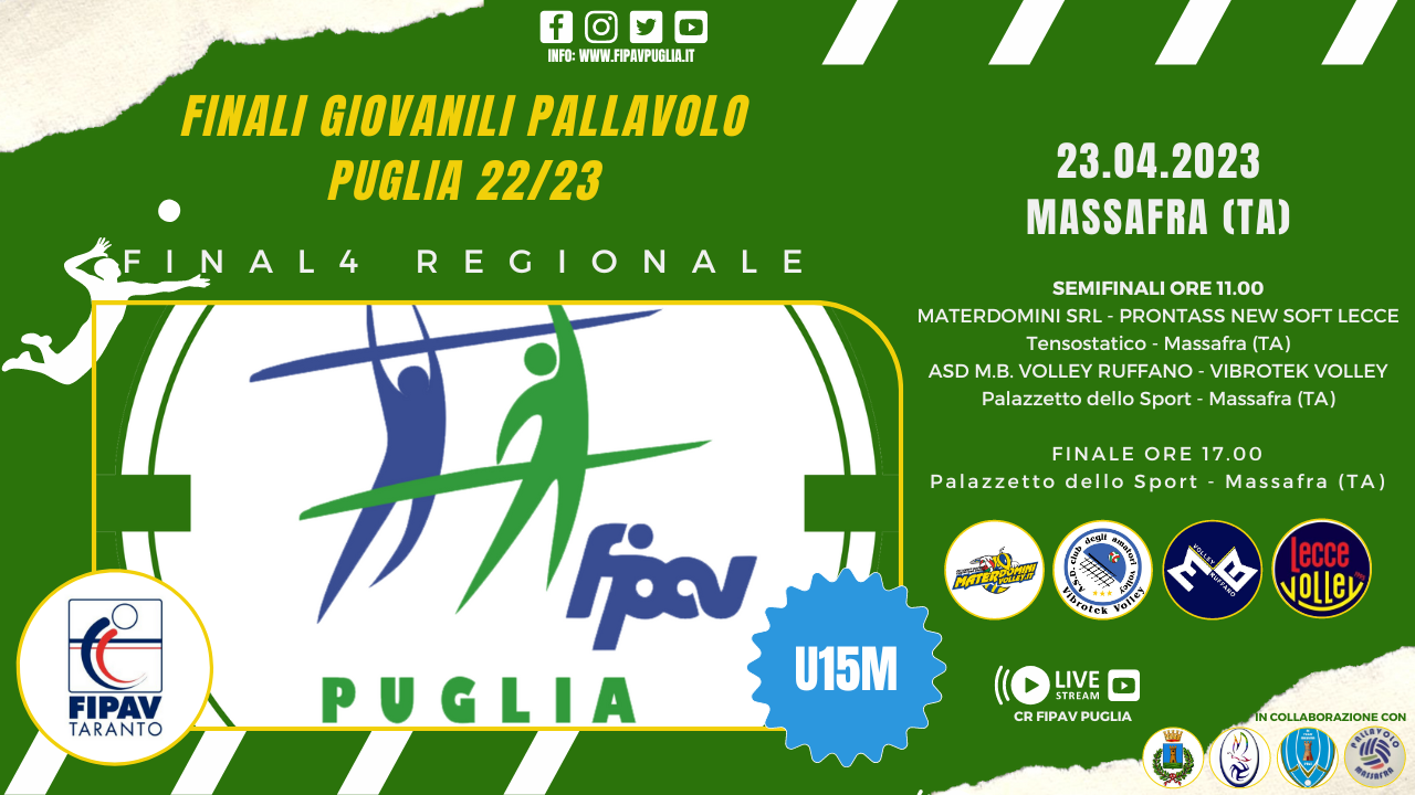 Sarà la città di Massafra ad ospitare domenica 23 aprile la fase finale regionale del campionato U15 maschile che vedrà le quattro semifinaliste contendersi il titolo di campioni regionali U15 oltre al pass per le Finali Nazionali Giovanili in programma a Prato, in Toscana, dal 16 al 21 maggio 2023. La Final4 è organizzata dal CR FIPAV Puglia e dal CT FIPAV Taranto.