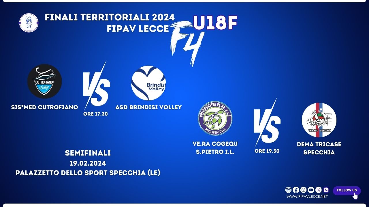 Sarà il Palazzetto dello Sport di Specchia ad ospitare la Final4 territoriale U18 femminile FIPAV Lecce in programma il 19 e il 20 febbraio con le semifinali che si giocheranno lunedì e le finali martedì. Le due finaliste avranno accesso alla fase regionale. La giornata di finali sarà possibile seguirla sulla pagina facebook del CT FIPAV Lecce.