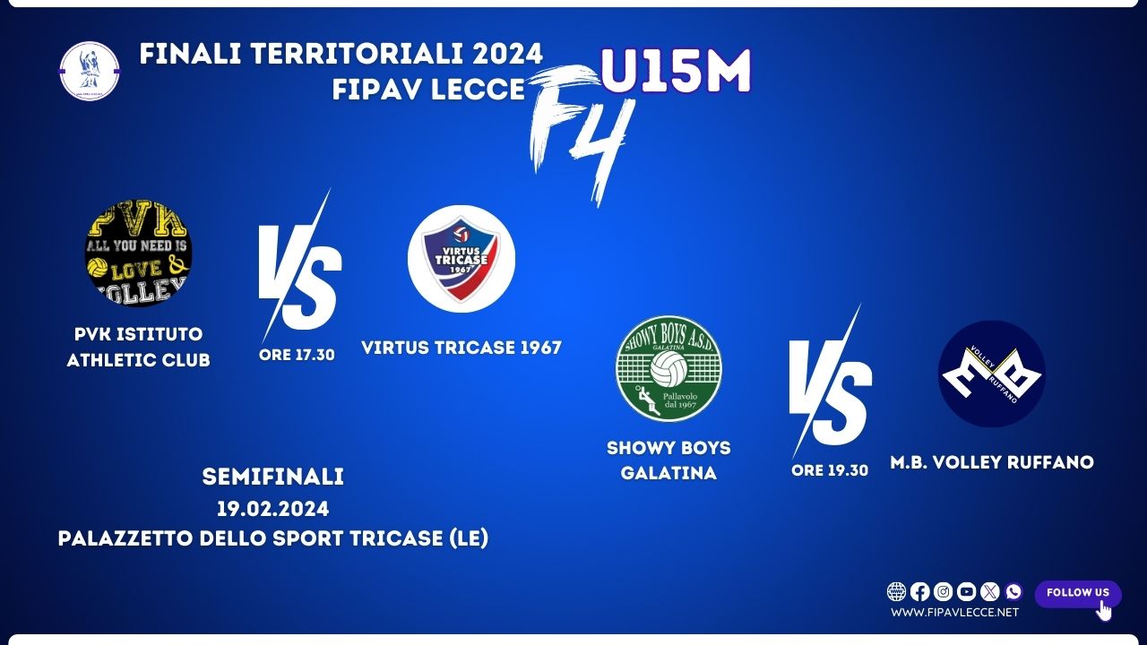 Si giocherà a Tricase la Final4 territoriale FIPAV Lecce U15 maschile con in palio il titolo di campioni territoriali e due pass per la fase regionale per le due finaliste. Ad accedere alla Final4, grazia alla vittoria nei Quarti di Finale, Carmiano, Tricase, Galatina e Ruffano. Sarà possibile seguire la giornata di finali sulla pagina facebook del CT FIPAV Lecce.