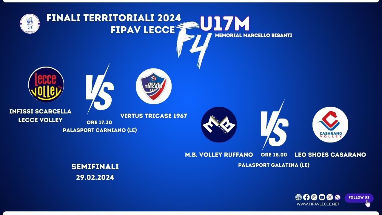 Il CT FIPAV Lecce, con la preziosa collaborazione delle società ASD Polisportiva Carmiano e SBV Galatina, organizza la Final4 territoriale U17M per l’assegnazione del Memorial Marcello Bisanti che oltre al titolo di campioni territoriali di categoria consegnerà due pass per la fase regionale U17M. Le semifinali si giocheranno sui campi dei Palasport di Carmiano e Galatina nel pomeriggio di giovedì 29 febbraio mentre le finali, 1/2 e 3/4, si giocheranno a Carmiano nel pomeriggio di venerdì 1 marzo.