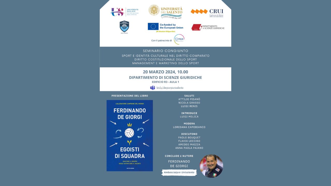 Il Commissario Tecnico della nazionale italiana maschile di volley campione del mondo Ferdinando De Giorgi sarà ospite del Dipartimento di Scienze Giuridiche dell’Università del Salento mercoledì 20 marzo alle ore 10.00 per presentare il suo libro “Egoisti di Squadra”, scritto con la consulenza del pedagogista della nazionale Giuliano Bergamaschi, edito da Mondadori.