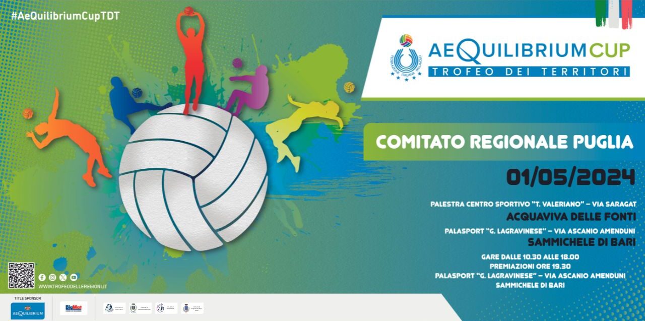 Si giocherà mercoledì 1 maggio tra Acquaviva delle Fonti e Sammichele di Bari la 32^ edizione del Torneo “Meschini” – Trofeo dei Territori Puglia 2024, manifestazione della Federazione Italiana Pallavolo sponsorizzata da AIA con il marchio AeQuilibrium. Le gare sono in programma dalle 10.30 alle 18.00, mentre alle 19.30 si terranno le premiazioni presso il Palasport di Sammichele di Bari.