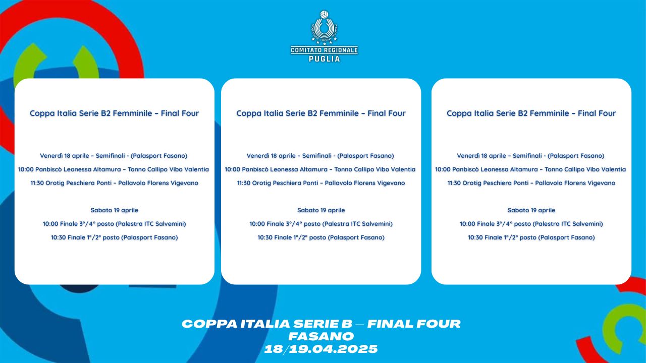 La giornata inaugurale di venerdì vedrà impegnate tutte e tre le pugliesi nelle rispettive semifinali. Alle ore 10:00, al Palasport di Fasano, la Leonessa Altamura affronterà la Tonno Callipo Vibo Valentia nella prima semifinale della Coppa Italia di Serie B2 Femminile. Alle ore 19:00, sempre al Palasport, toccherà alla Pantaleo Podio Fasano, impegnata contro il GSO Villa Cortese per la semifinale di Serie B1 Femminile. Alla stessa ora, ma alla Palestra ITC Salvemini, sarà invece il momento del debutto per il Green Volley Galatone, che affronterà il TMB Monselice nella seconda semifinale della Coppa Italia di Serie B Maschile.