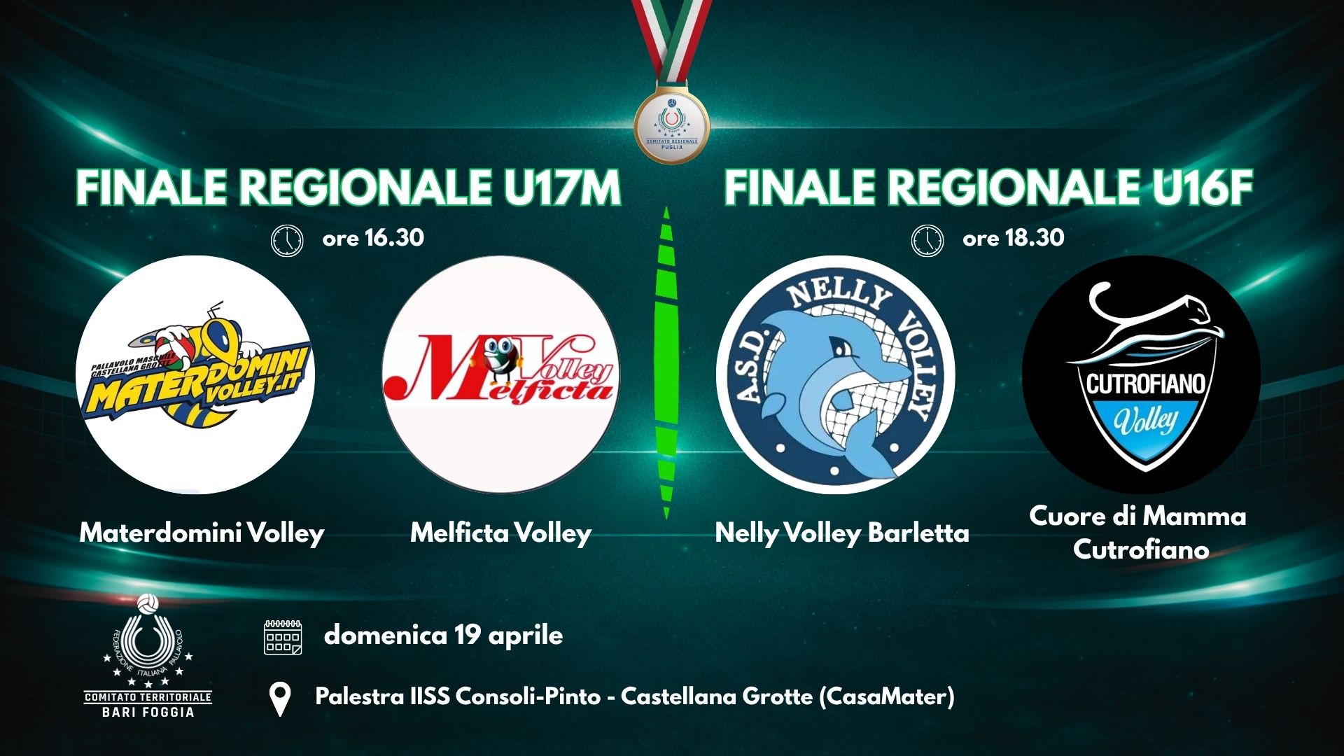 A seguire, alle ore 18:30, spazio alla Finale Under 16 Femminile tra Progetto Nelly Volley Barletta e Cuore di Mamma Cutrofiano, con in palio il titolo regionale e il pass per le BigMat Finali Nazionali Under 16 Femminili, in programma ad Assisi (PG) dal 18 al 24 maggio.